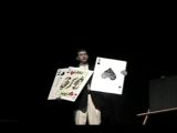 ステージに上がったマジシャンはカードを取り出しますが、カードが小さくて見えないと観客からクレームがつきます。ならばと取り出したのはジャンボカードよりも大きなカード。エース、キング、クイーンの3枚でマジックを行います。