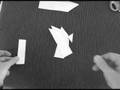 長方形の白い紙。上の辺と左の辺が重なるように折り、三角形を作るように左の角を右へ。家のような形になったら真ん中で半分に折ります。この状態で2箇所にハサミをいれます。バラバラになった紙片を組み合わせていくと、「天国と地獄」が現れます。