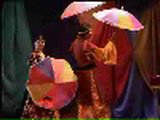 パラソルを手に登場したマジシャン。まずはパラソルの分裂です。次に、火のついた紙を円い容器に入れると、炎が消えてリボンがあふれ出てきます。続いて黒い布を取り出すマジシャン。グルグルと布を振り回すと真っ黒だった布がカラフルに色づき、布の中からパラソルが登場します。さらにキャンドルに筒をかぶせておまじないをかけ、筒を取り除くとキャンドルが消えてパラソルが開きます。この後も、分裂させたシルクからパラソルを取り出したり、反対に複数のシルクを1つにまとめて中からパラソルを取り出します。マジックが終わるころにはステージ中がパラソルだらけになってしまいます。