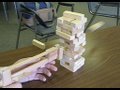 長方形の木のピースを3本ならべて正方形を作り、その正方形の向きをを90度変えたものを積み重ね続けてタワーを作ります。積み木の塔が出あがったらゲームスタート。交互にピースを1本ずつ抜いてタワーの上に積み重ねていきます。バランスを崩してタワーを壊してしまったら負け。この「ジェンガ」というゲームで難しいのはピースの抜き方です。木でできているのでピース同士の摩擦が強く1つを動かせば周りにも影響します。また、まっすぐ抜かないとタワーが揺れてしまいます。積み重なったものを一瞬でバランスよく抜き出すにはどうすれば良いか。そう考えて作られたのがこちらの「ジェンガピストル」。引き金を引くとピストルの先端から勢いよく木の棒が飛び出します。狙ったピースを一瞬でタワーから抜くことができます。「だるま落とし」の発想ですね。