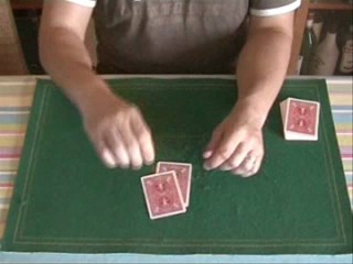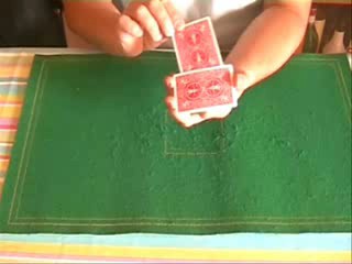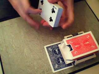 マジシャンの前には2組のトランプがあります。裏面が青いトランプと赤いトランプ。マジシャンは、まず青いトランプを箱から出し、シャッフルしてから無作為に1枚選んでテーブルに伏せて置きます。次に赤いトランプを箱から出し、シャッフルしてから表を上にして広げます。じっくりとカードを選ぶマジシャン。ここで先ほど選んだ青いカードと同じカードを選べば大成功です。スペードの7を選んだマジシャンは、答え合わせのために伏せておいた青いカードをめくります。結果はダイヤのエース。はずれてしまった、と諦めるのはまだ早い。もう一度チャンスがあります。マジシャンが赤いカードの裏面をめくると、そこには「ダイヤのエース」と書かれています。