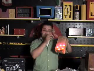 マジシャンは空中から光をつまみ出すと、左手に持った紙袋に入れます。紙袋は薄いので、中で光っているのが見えます。マジシャンは次々と、空中や口の中から光を取り出します。どんどん袋に入れていっぱいになったら、フッと吹き消してしまいます。