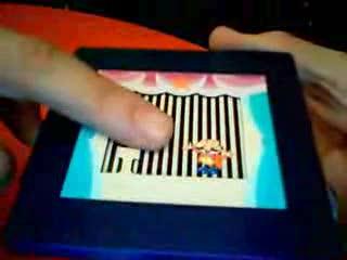 マジシャンが用意したのは額縁のような小さな薄い箱と、1枚のプレート。プレートには横たわる女性と髭のマジシャンが描かれています。額縁の方にあるのはマジックショーのステージのようです。マジシャンはプレートを額縁に差し込みます。2つの絵が合体して、ステージ上の台に女性が横たわり、髭のマジシャンがおまじないをかけている絵になりました。ここで、マジシャンは額縁の中の女性に指を重ねます。ゆっくりと上に指をずらしていくと、台の上から女性の姿が消え、マジシャンの指の下から現れます。絵の中では髭のマジシャンのおまじないで女性が空中浮遊している形になります。