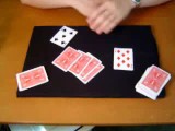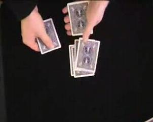 ストーリーのあるマジック。泥棒キングとジャック刑事の物語です。物語は動画を観ていただくとして、ここでは現象を説明します。マジシャンは1組のトランプからダイヤのキングとダイヤの8、9、スペードのジャックとスペードのエース、クローバーのエースを抜き出します。キングは泥棒でダイヤの8と9は盗まれたダイヤです。ジャックは泥棒キングを追う刑事で、2枚のスペードは警察犬という設定。表を上にした2枚のダイヤに、裏を上にしたキングを挟み、トランプの束に挿し込みます。さらにスペードのジャックもトランプの束に入れ、何度か混ぜます。次に、表を向いた2枚のエースでトランプの束を挟みます。強く振るとトランプの束が飛びますが、2枚のエースの間にはダイヤのキングが挟まれています。そして束の中のダイヤのカードの間にはスペードのジャックが挟まれています。