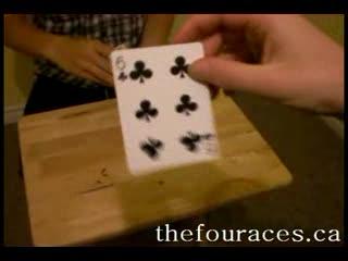 マジシャンはトランプの束からあらかじめ4枚のエースを抜いてテーブルに並べています。エースを集め、トランプの束の上に置きます。そして再び上から4枚、つまり今乗せたエースをテーブルに伏せて並べます。次に、エースを1枚、トランプの束の一番下に入れます。しかし、カードを弾くとエースは一番上にあがってきてしまいます。2枚目のエースはトランプのトップに置きますが、カードを弾くと一番下に移動してしまいます。3枚目のエースは、表を上にした束の中に裏向きで挿し込みますが指を鳴らしてトランプの束を裏向きにすると、一番上に裏向きになって現れます。最後のエースは普通に差し込みますが、手首を捻ると束の中で1枚だけ表を向いてしまいます。