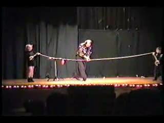 ステージにはマジシャンとともに大きな骨組みだけの箱が出現。布で箱を覆い、その布を一気に外すと箱の中から2人の子供が現れます。子供をアシスタントにしてマジックショーは続きます。長いロープの両端をアシスタントに持たせると、マジシャンはロープの真ん中をハサミで切ってしまいます。マジシャンは切ったロープを結びますが、アシスタントがロープを引くと結び目のない1本のロープに戻ってしまいます。次にアシスタントの1人傘を、もう1人には袋を持たせます。袋の中にはひとつなぎになった色とりどりのシルクを入れます。マジシャンは新聞紙を取り出して傘を包み、傘と袋を交換するような動きをします。新聞から傘を抜くと、傘の布が消えて、先ほど袋にあったシルクがバラバラになって傘の骨にぶら下がっています。一方の袋からは、傘に張られていた布が出てきます。