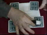 マジシャンは白いハンカチを取り出します。4つ折りにしたハンカチをテーブルに置きますが、何度か引っくり返してテーブルやハンカチに仕掛けがないことを確認します。次にトランプを取り出すと適当にカードを抜き取り、ハンカチの4隅に伏せて置いていきます。2枚目のカードだけは置く前に表を確認。スペードのキングです。ハンカチの4隅にカードを置いたら、マジシャンは小型のライトを取り出します。ライトをカードの上にかざしていくと、スペードのキングの上でだけ点灯します。カードを置く段階でめくっていますが、本来は観客の選んだカードをライトが当てるマジックのようです。