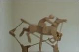 さて、動画の紹介です。騎手が乗った馬の人形にはいくつかの棒がついています。一番太い棒は台の下から伸びており、ハンドルを回すことで回転しながら上下に動きます。この回転にあわせて馬の体が動くのですが、足や首などのパーツは台とつながっており、体の動きに連動して馬の走りを再現するように動きます。ハンドルを回すだけで複雑な動きを再現する「からくり」が見事ですね。