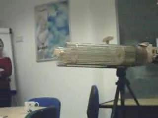 2本の銃身には大量の輪ゴムを装着できます。先端にかけたゴムを歯車にかけ、引き金を引くと左右の銃身の歯車が押されてゴムが開放されます。銃身は回転しているので、大量の輪ゴムが次々と発射されていきます。的をなぎ倒す威力には驚きですね。子供よりお父さんが喜びそうなマシンです。