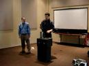 マジシャンは観客を横に立たせ、自分と同じ動きをするよう指示します。右手で前方を指差し、左手でも指差し、指だけを内側に曲げたら動きをストップ。その指をホルダーに見立ててトイレットペーパーを持たせたら、紙玉のコメディを行います。