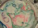 ボールに牛乳を注ぎ、上から静かにインクを垂らします。あちこちに色々な色のインクを垂らしますが、この時点ではインクは拡散せず一箇所にとどまっています。しかし、上から洗剤を垂らすとインクは一気に外側に移動。ここまでは洗剤のCMでも見るような動きです。問題はこの後。ボールの縁まで移動したインクは、壁面に沿ってボールの底に沈み、そこから湧き上がるように上昇してきます。火にかけられた水が対流するように、牛乳とインクと洗剤が水中でグルグル動いて、白い水面に美しいマーブル模様を作り上げます。